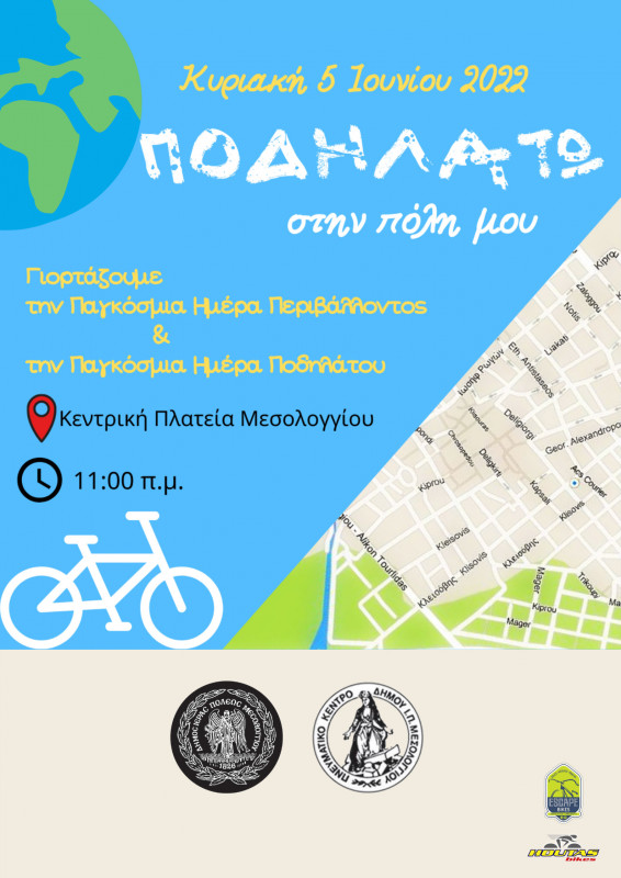 Στο πλαίσιο του εορτασμού της Παγκόσμιας Ημέρας ποδηλάτου στις 3 Ιουνίου 2022 και της Παγκόσμιας Ημέρας περιβάλλοντος στις 5 Ιουνίου ο Δήμος Ι.Π. Μεσολογγίου και το Πνευματικό Κέντρο για να προβάλουν τα οφέλη της χρήσης του ποδηλάτου στη πόλη μας διοργανώνουν τον ποδηλατικό γύρο της πόλης την Κυριακή 5 Ιουνίου 2022 και ώρα 11:00 π.μ.