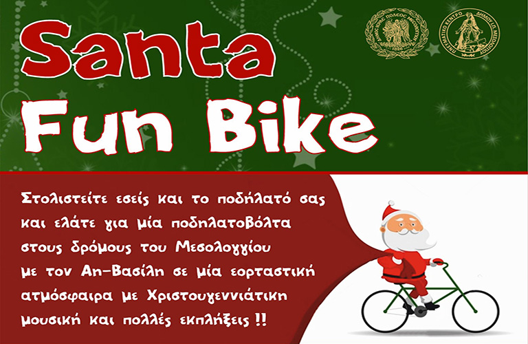 Την Παραμονή των Χριστουγέννων και ώρα 11:30 το πρωί μικροί και μεγάλοι θα συμμετάσχουν στην Χριστουγεννιάτικη Ποδηλατοβόλτα «Santa FunBike» (Εκκίνηση –Τερματισμός Πλατεία Μπότσαρη) μεταφέροντας το αισιόδοξο μήνυμα των Χριστουγέννων και της Πρωτοχρονιάς.