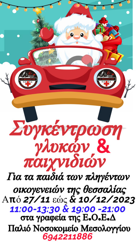 Από σήμερα 27/11 έως και τις 10/12 στα γραφεία της ΕΟΕΔ (στο Παλιό Νοσοκομείο Μεσολογγίου) ,θα συγκεντρωθούν γλυκά και παιχνίδια για τα παιδιά των πληγέντων οικογενειών της Θεσσαλίας.