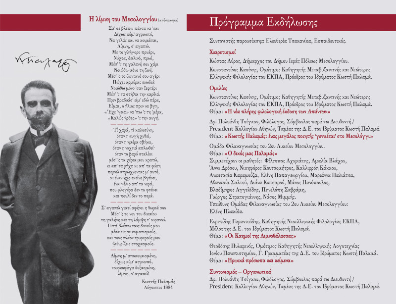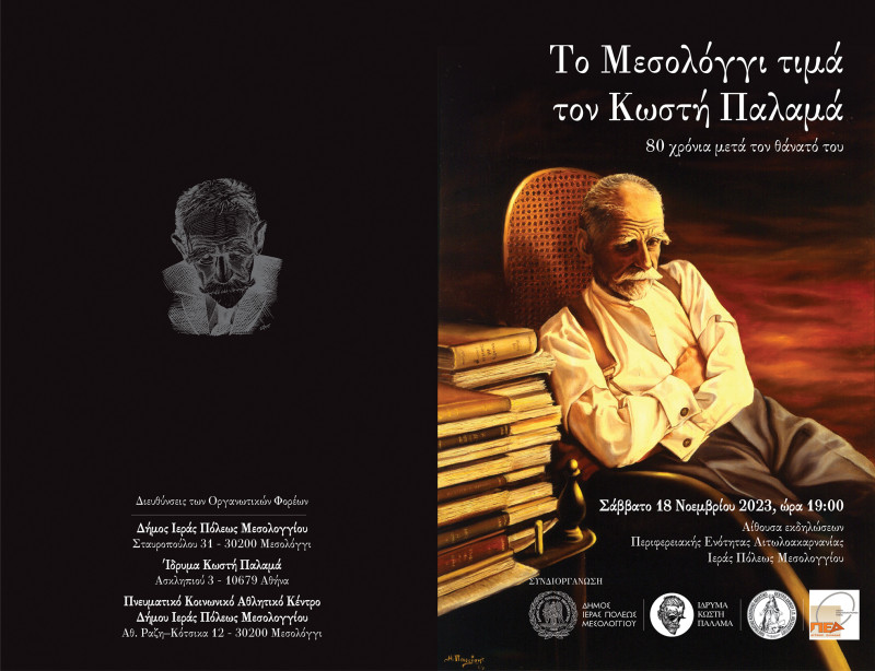 Το Σάββατο, 18 Νοεμβρίου 2023 στην αίθουσα εκδηλώσεων Π.Ε. Αιτωλοακαρνανίας στην Ι.Π. Μεσολογγίου και ώρα 19:00 πραγματοποιηθεί η Επετειακή Εκδήλωση «Το Μεσολόγγι τιμά τον Κωστή Παλαμά» επ’ αφορμή της συμπλήρωσης 80 ετών από το θάνατο του σπουδαίου ποιητή.