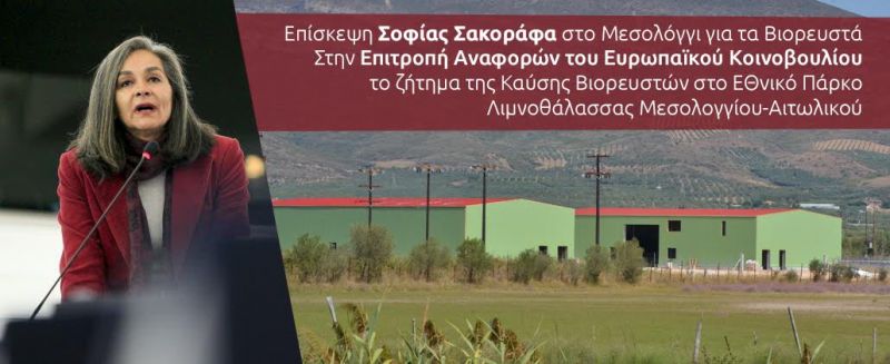 Το διήμερο 2 & 3 Νοεμβρίου, ημέρες Πέμπτη και Παρασκευή, θα επισκεφτεί το Μεσολόγγι η ανεξάρτητη ευρωβουλευτής Σοφία Σακοράφα. Η κ. Σοφία Σακοράφα, με την ιδιότητα του μέλους της Επιτροπής Αναφορών του Ευρωπαϊκού Κοινοβουλίου, θα επισκεφθεί το Μεσολόγγι προσκεκλημένη από την Πρωτοβουλία Πολιτών Λιμνοθάλλαζα, τον Δήμαρχο Μεσολογγίου και φορείς της πόλης μας, με αφορμή την αναφορά που πρόκειται να κατατεθεί στην Επιτροπή Αναφορών του Ευρωπαϊκού Κοινοβουλίου για το περιβαλλοντικό έγκλημα που συντελείται αυτή τη στιγμή στο Εθνικό μας Πάρκο, με την κατασκευή των τεσσάρων μονάδων καύσης 6.500 τόνων βιορευστών ετησίως εντός αυτού.