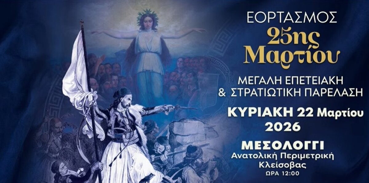 Στο Μεσολόγγι από νωρίς το πρωί της Κυριακής, 22 Μαρτίου 2026 οι εκδηλώσεις για τον Εορτασμό της 25ης Μαρτίου – Δείτε live την Πολιτική και Στρατιωτική Παρέλαση.