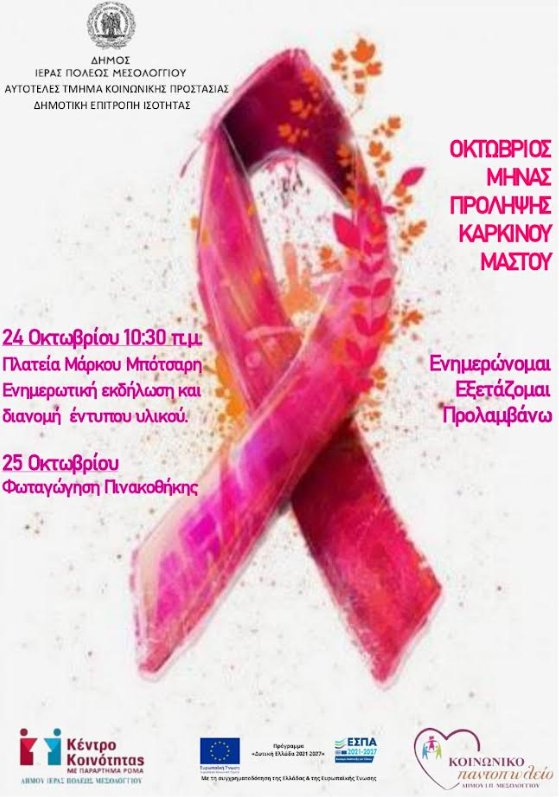 Οι Κοινωνικές Δομές και η Δημοτική Επιτροπή Ισότητας των Φύλων του Δήμου Ιερής Πόλης Μεσολογγίου, σας προσκαλούν με χαρά να συμμετάσχετε στη δράση ενημέρωσης για τον Καρκίνο του Μαστού, που θα πραγματοποιηθεί την Παρασκευή, 24 Οκτωβρίου 2025, στις 10:30 π.μ., στην Κεντρική Πλατεία Μάρκου Μπότσαρη στο Μεσολόγγι, με αφορμή την Παγκόσμια Ημέρα κατά του Καρκίνου του Μαστού.