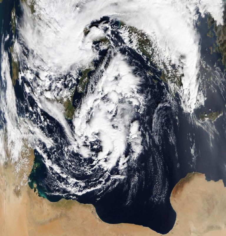 Σε σελίδα του meteo.gr στο Facebook ανέβηκε και μια φωτογραφία από τη NASA. Δείχνει τη δημιουργία του μεσογειακού κυκλώνα νοτιοανατολικά της Σικελίας.