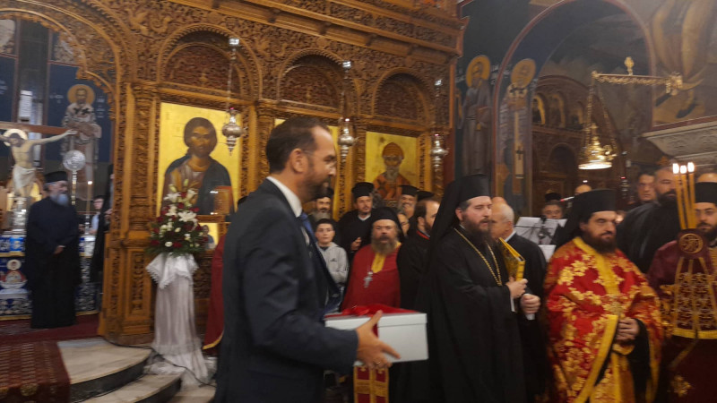 Αλλά και του Σεβασμιότατου Μητροπολίτη Ναυπάκτου και Αγίου Βλασίου κ. Ιερόθεου, που ήταν άξιος τοποτηρητής στην Μητρόπολη μας και αποτέλεσε πηγή πνευματικής εμπειρίας. Πάντα με τη συμβολή και το έμπρακτο ενδιαφέρον του Πρωτοσύγκελου της Μητρόπολης Αρχιμανδρίτη Επιφάνιου. Εκ μέρους του Δήμου Αγρινίου παρακαλώ δεχθείτε, ως ένδειξη σεβασμού και τιμής, ένα δώρο υψηλού συμβολισμού για τους Αγρινιώτες. Έργο συμπατριώτη μας, η προσωπογραφία του Παπαποστόλη. Με συγκίνηση σας προσφέρω την προσωπογραφία του Αρχιμανδρίτη Απόστολου Φαφούτη, του μακαριστού Γέροντα που ανακούφισε τον πόνο, γλύκανε τις πληγές, έγινε η παρηγοριά για τους ανήμπορους. Του ιερέα που «έχαιρε μετά χαιρόντων, έκλαιε μετά κλαιόντων». Στην καρδιά μας είναι ο Άγιος χωρίς φωτοστέφανο. Οι παλαιότεροι θυμούνται ότι πρωτοστάτησε στην ανέγερση του νέου Ιερού Ναού του Αγίου Χριστοφόρου. Σε κάθε πέτρα έχει βάλει την υπογραφή του με τον ιδρώτα και το αίμα του. Δε λησμονούμε ότι, με μοναδικό όπλο την αγάπη, στις 14 Σεπτεμβρίου 1944, απέτρεψε το αιματοκύλισμα της πόλης. Ο Παπαποστόλης συνεχίζει να ζει μέσα στις καρδιές των Αγρινιωτών και η ιερή μορφή του, ακόμη και σήμερα, είναι βάλσαμο στην ψυχή μας. Σεβασμιότατε Μητροπολίτη, Εκφράζω θερμά και ειλικρινή συγχαρητήρια, ευχόμενος διακονία επ’ αγαθώ της κοινωνίας.