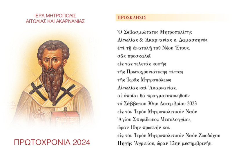 Την Πρωτοχρονιάτικη Βασιλόπιτα της Ιεράς Μητροπόλεως Αιτωλίας και Ακαρνανίας θα ευλογήσει ο Σεβασμιότατος Ποιμενάρχης μας, Μητροπολίτης Αιτωλίας και Ακαρνανίας κ.κ. Δαμασκηνός, το Σάββατο, 30 Δεκεμβρίου 2023.