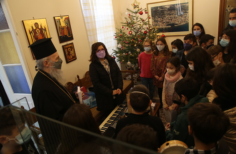 Τά παιδιά μέ ὑποδειγματική τάξη γέμισαν τόν προθάλαμο τοῦ Γραφείου τοῦ Μητροπολίτη, ἔστησαν τό ἁρμόνιο καί ἐνώπιον τοῦ Σεβασμιωτάτου ἔψαλαν μέ ὡραῖες φωνές, συντονισμένα στόν ρυθμό πού ἔδινε ἡ μουσικός τους μέ τό ἁρμόνιο καί ἕνας μαθητής μέ τό τουμπερλέκι, παραδοσιακά κάλαντα, ἀλλά καί τά κάλαντα ὅπως ψάλλονται στίς μέρες μας.