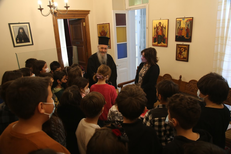 Τά παιδιά μέ ὑποδειγματική τάξη γέμισαν τόν προθάλαμο τοῦ Γραφείου τοῦ Μητροπολίτη, ἔστησαν τό ἁρμόνιο καί ἐνώπιον τοῦ Σεβασμιωτάτου ἔψαλαν μέ ὡραῖες φωνές, συντονισμένα στόν ρυθμό πού ἔδινε ἡ μουσικός τους μέ τό ἁρμόνιο καί ἕνας μαθητής μέ τό τουμπερλέκι, παραδοσιακά κάλαντα, ἀλλά καί τά κάλαντα ὅπως ψάλλονται στίς μέρες μας.