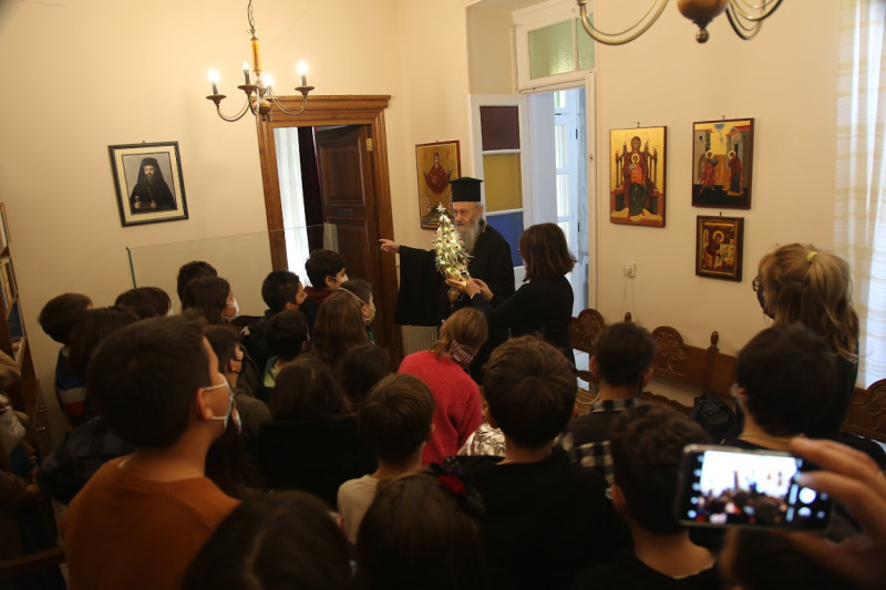 Ὁ Σεβασμιώτατος ἔδωσε τίς εὐχές του στά παιδιά καί τούς δασκάλους τους, τούς εὐχαρίστησε καί τούς συνεχάρη γιά τήν πρωβουλία τους καί τήν πολύ καλή ἀπόδοση τῶν καλάντων. Στό τέλος τοῦ δώρισαν ἕνα μικρό χριστουγεννιάτικο δένδρο, γιά τήν χριστουγεννιάτικη διακόσμηση τοῦ Γραφείου του καί τό βιβλίο «Ἐκπαίδευση καί Οἰκονομική Ἀνάπτυξη γιά τήν Ἀειφορία», ἕνας ἀπό τούς συγγραφεῖς τοῦ ὁποίου εἶναι ὁ διευθυντής τοῦ Σχολείου κ. Ἀριστείδης Λουκόπουλος. Ὁ Σεβασμιώτατος τούς ὑποσχέθηκε ὅτι θά ἐπισκεφθῆ τό Σχολεῖο τους γιά τήν κοπή τῆς Βασιλόπιττας καί τότε θά τούς δωρίση καί αὐτός τό τελευταῖο βιβλίο του, γιά τό ὁποῖο τούς εἶπε μέ λίγα λόγια ποιό εἶναι τό περιεχόμενό του.