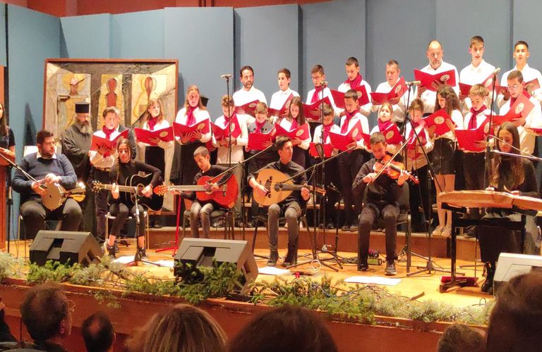 Οι μαθητές της Σχολής Βυζαντινής Μουσικής Μεσολογγίου «Άγιος Ιωάννης ο Κουκουζέλης», της Ιεράς Μητροπόλεως Αιτωλίας και Ακαρνανίας έψαλλαν επίκαιρους βυζαντινούς ύμνους και τραγούδησαν χριστουγεννιάτικα τραγούδια και παραδοσιακά κάλαντα, με τη συνοδεία μουσικών οργάνων.