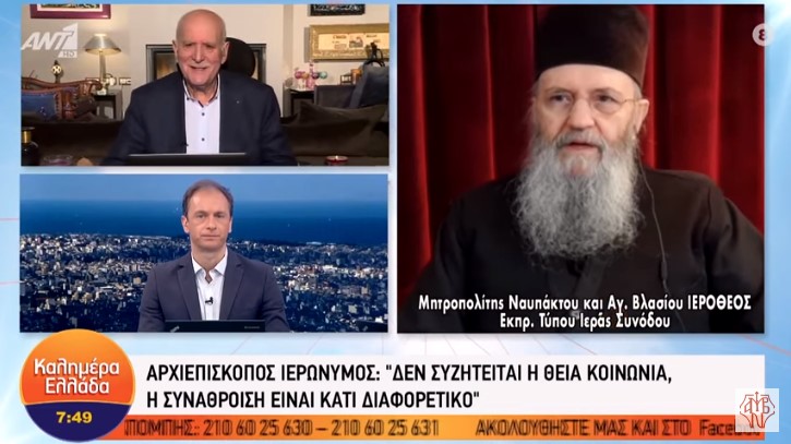 Την Μεγάλη Τετάρτη, 15 Απριλίου ε.έ. ο Σεβασμιώτατος Μητροπολίτης Ναυπάκτου και Αγίου Βλασίου κ. Ιερόθεος, ως εκπρόσωπος τύπου της Εκκλησίας της Ελλάδος για τα θέματα της πανδημίας του κορωνοϊού (covid-19), απάντησε στις ερωτήσεις του δημοσιογράφου Γιώργου Παπαδάκη του τηλεοπτικού σταθμού ANT1.