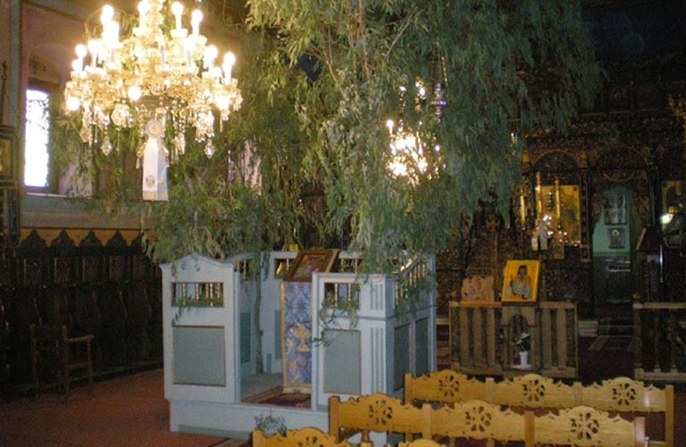 Η εξέδρα εκτός από τον πάγιο διάκοσμο της, σε κάθε χρήση της, την ημέρα του αγιασμού των υδάτων, περιλάμβανε στις τέσσερες εσωτερικές γωνίες της, μεγάλους κλάδους ευκαλύπτων, με πλούσιο φύλλωμα. Μια αναπαράσταση της βάπτισης στον Ιορδάνη ποταμό.