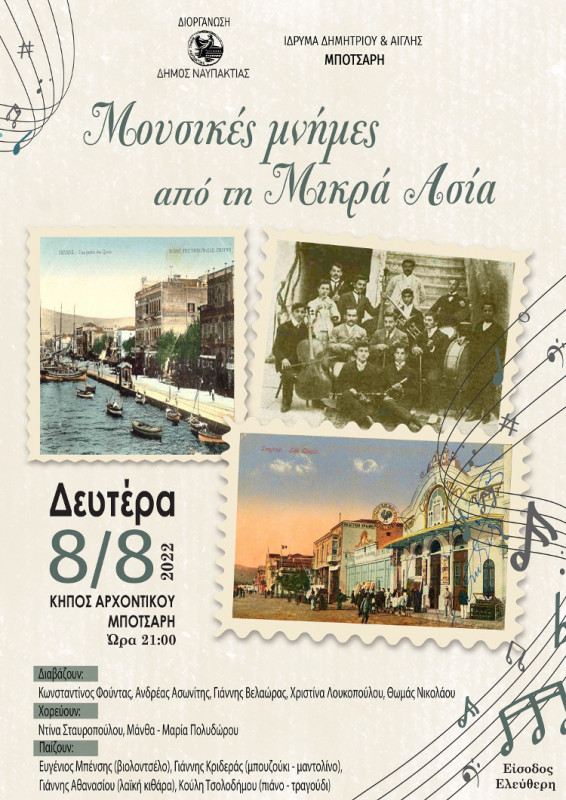 Ο Δήμος Ναυπακτίας τιμώντας τα 100 χρόνια από τη Μικρασιατική Καταστροφή διοργανώνει με την υποστήριξη του Ιδρύματος Δημητρίου και Αίγλης Μπότσαρη την εκδήλωση «Μουσικές Μνήμες από τη Μικρά Ασία», τη Δευτέρα, 8 Αυγούστου 2022 και ώρα 21:00 στον Κήπο του Αρχοντικού Μπότσαρη.