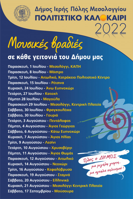 Καλοκαιρινά βράδια με νότες και μελωδίες στις πόλεις και τα χωριά του Δήμου Ι.Π. Μεσολογγίου