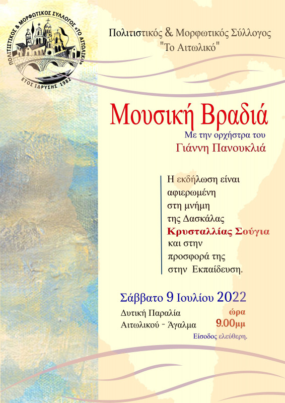 Η εκδήλωση συμπίπτει με το ετήσιο μνημόσυνο της αγαπημένης μου Θείας και θα είναι ιδιαίτερη τιμή να σας συναντήσουμε όλους σε αυτή την όμορφη μουσική βραδιά, στο άγαλμα, δίπλα από το Γυμνάσιο/ Λύκειο Αιτωλικού.