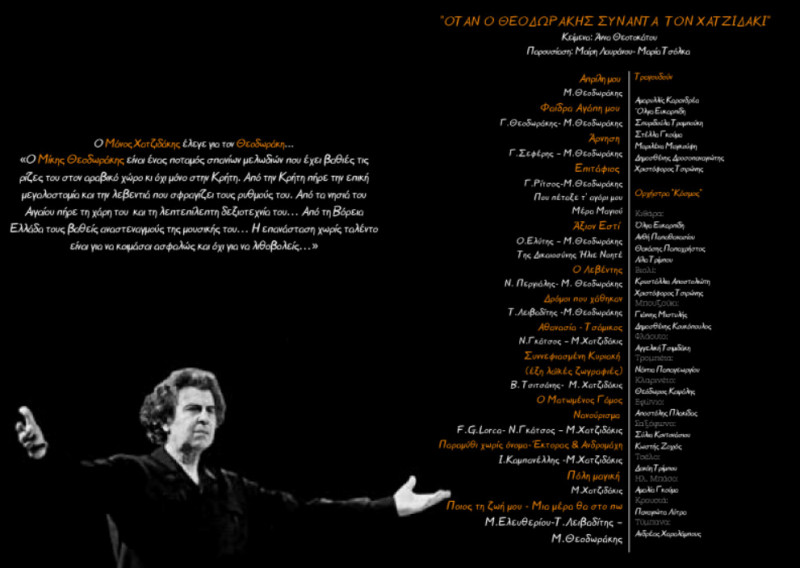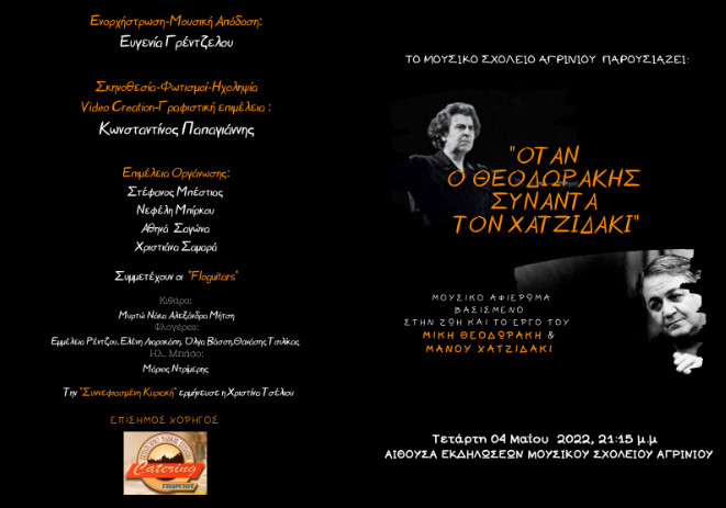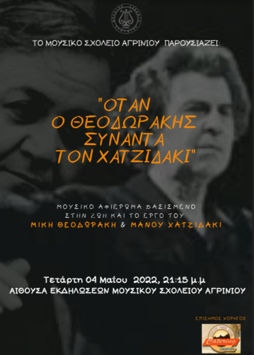 Το Μουσικό Σχολείο Αγρινίου παρουσιάζει την Τετάρτη, 4 του Μάη στις 21:15 στην Αίθουσα εκδηλώσεων του Σχολείου ένα μουσικό Αφιέρωμα βασισμένο στη ζωή και το έργο του Μίκη Θεοδωράκη και Μάνου Χατζιδάκι με τίτλο: «Όταν ο Θεοδωράκης συναντά τον Χατζιδάκι».