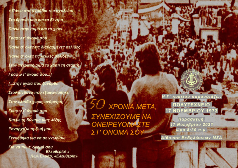 Η Διεύθυνση και ο Σύλλογος Διδασκόντων του Μουσικού Σχολείου Αγρινίου διοργανώνουν εκδήλωση μνήμης για την Επέτειο των 50 χρόνων από την εξέγερση του Πολυτεχνείου στην αίθουσα εκδηλώσεων του Μουσικού Σχολείου την Παρασκευή, 17 Νοεμβρίου 2023 στις 8:30 π.μ.