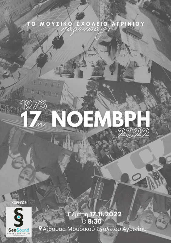 Το Μουσικό Σχολείο Αγρινίου παρουσιάζει την Πέμπτη, 17 Νοεμβρίου 2022 στις 08:30 Εκδήλωση για τον Εορτασμό της Επετείου από την Εξέγερση του Πολυτεχνείου, στην Αίθουσα Εκδηλώσεων του ίδιου του Σχολικού Συγκροτήματος.