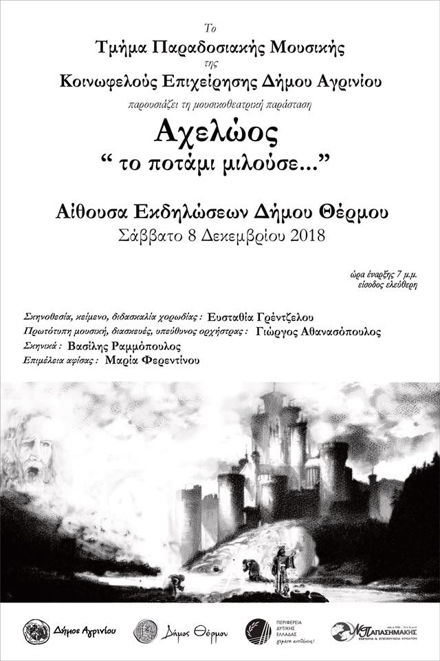 Το Τμήμα Παραδοσιακής Μουσικής της Κοινωφελούς Επιχείρησης του Δήμου Αγρινίου, παρουσιάζει τη μουσικοθεατρική παράσταση «Αχελώος. Το ποτάμι μιλούσε…», με θρύλους και τραγούδια της Αιτωλίας και Ακαρνανίας.