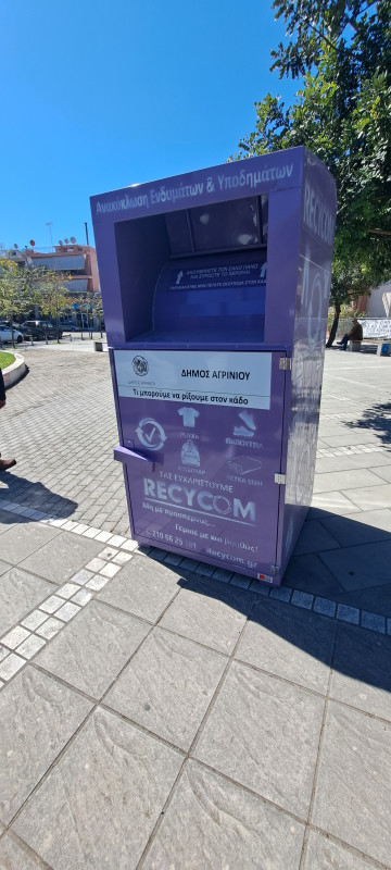 Τα σημεία που έχουν τοποθετηθεί οι ειδικοί μοβ κάδων ανακύκλωσης ενδυμάτων και υποδημάτων στον Δήμο Αγρινίου είναι τα εξής: