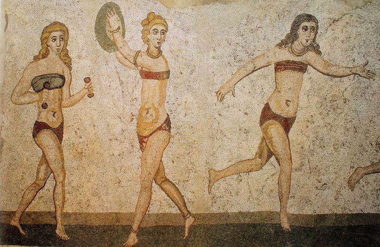 Εικονογραφήσεις γυναικών που φορούσαν ρούχα που μοιάζουν με μπικίνι κατά τη διάρκεια αγωνισμάτων στη ρωμαϊκή εποχή έχουν βρεθεί σε πολλές τοποθεσίες, με πιο γνωστή τη Villa Romana del Casale. Μόλις τρία χιλιόμετρα από την πόλη Piazza Armerina της Σικελίας βρίσκονται τα εκτεταμένα ερείπια μιας μεγάλης ρωμαϊκής βίλας, που ονομάζεται Villa Romana del Casale. Χρονολογείται στις αρχές του τέταρτου αιώνα μ.Χ. και περιέχει μια από τις μεγαλύτερες συλλογές αρχαίων ρωμαϊκών ψηφιδωτών οπουδήποτε. Έχει περιληφθεί στα Μνημεία Παγκόσμιας Κληρονομιάς της UNESCO.