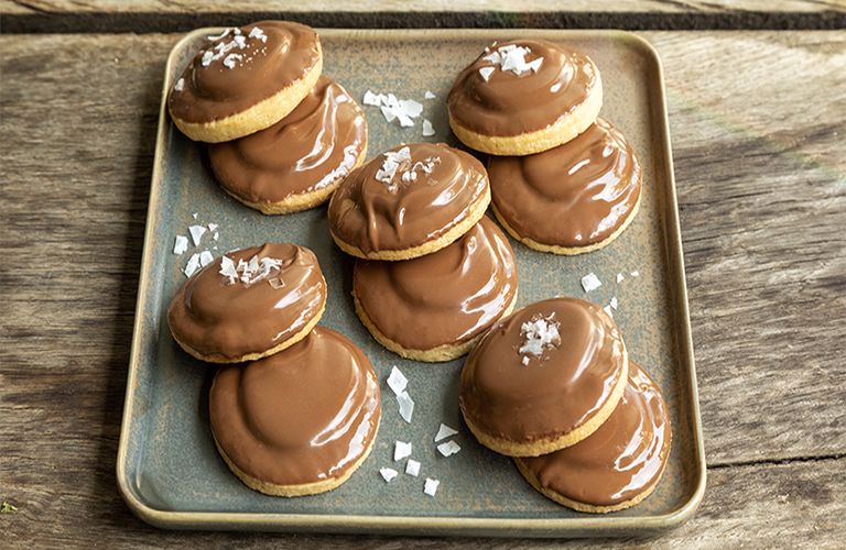 Βουτάμε το μπισκότο από την πλευρά της καραμέλας, μέσα στο μπολ με τη λιωμένη κουβερτούρα.
