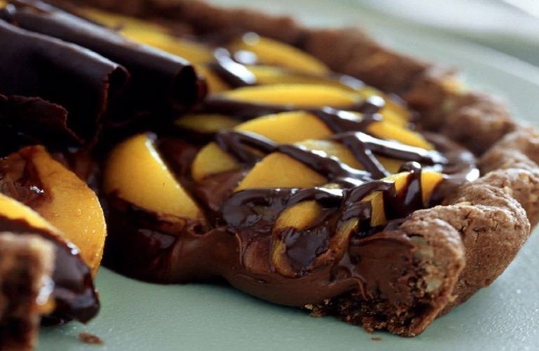 Μπισκοτένια τάρτα σοκολάτας με αχλάδια σε σιρόπι