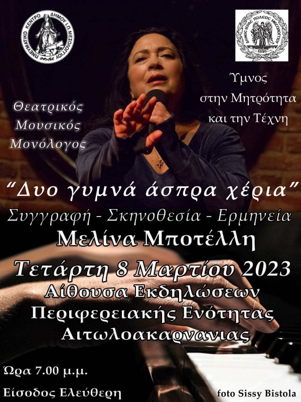 Η Μελίνα Μποτέλη έρχεται στο Μεσολόγγι με ένα έργο ύμνο προς τη Γυναίκα, τη Μητρότητα και την Τέχνη της Μουσικής / Τα «Δυο γυμνά άσπρα χέρια»