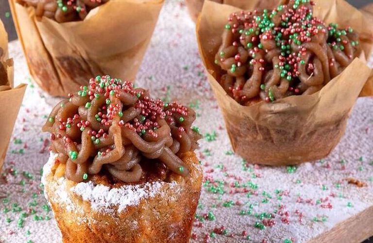 Στολίζουμε τα muffin με την κρέμα κάστανο και σερβίρουμε με ζάχαρη άχνη και τα κας κας.