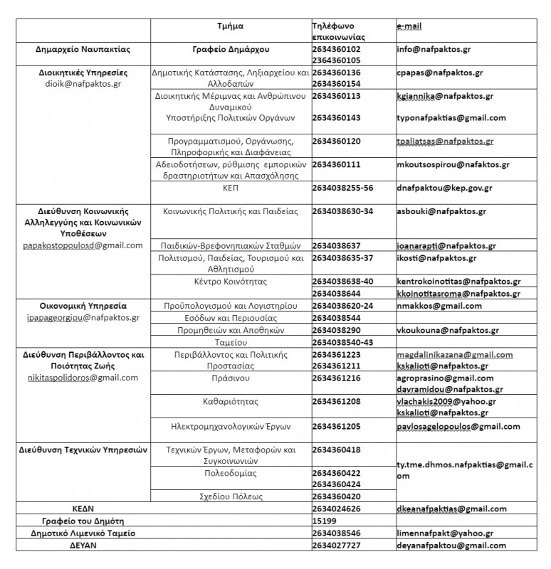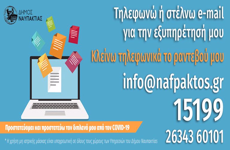 Ο Δήμος Ναυπακτίας, στο πλαίσιο των μέτρων που λαμβάνει για τον περιορισμό της εξάπλωσης των κρουσμάτων COVID-19, προτρέπει τους δημότες που επιθυμούν να εξυπηρετηθούν από τις υπηρεσίες του, από την Δευτέρα, 7 Σεπτεμβρίου 2020, να μην προσέρχονται σε αυτές, αλλά να επιλέγουν την επικοινωνία μέσω τηλεφώνου και e-mail ή να κλείνουν ραντεβού κατόπιν τηλεφωνικής συνεννόησης με το αντίστοιχο Τμήμα.