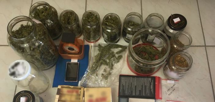 - Δυο ζυγαριές, ένας πλαστικός τρίφτης και τρία γυάλινα βάζα, με υπολείμματα κάνναβης,