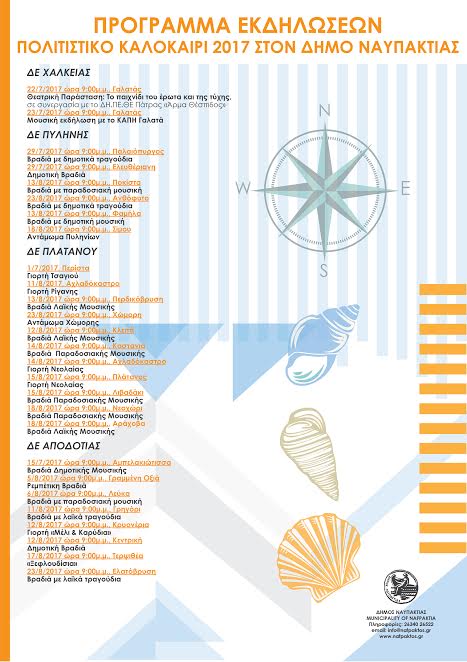 Ποικίλες εκδηλώσεις θα ομορφύνουν τα καλοκαιρινά μας βράδια, δίνοντας την ευκαιρία σε δημότες και επισκέπτες να απολαύσουν στιγμές δημιουργίας και πολιτισμού, σ’ ένα μοναδικά όμορφο περιβάλλον.