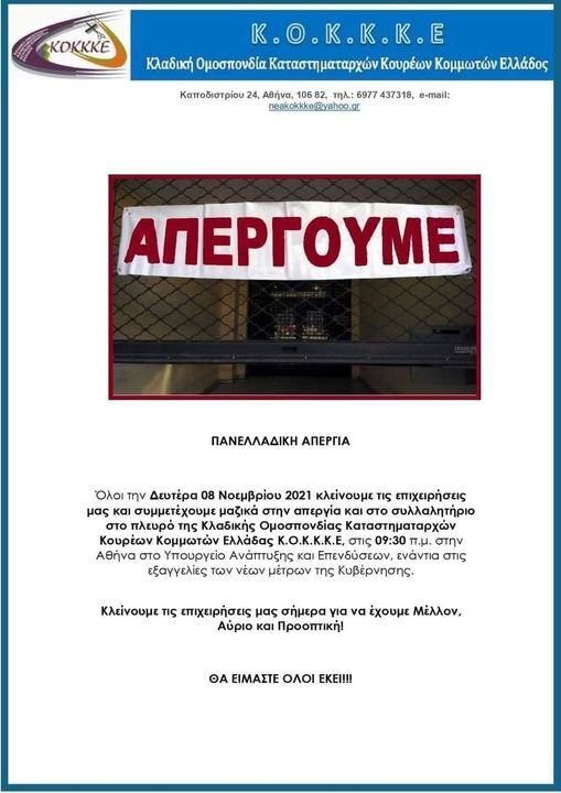 Κλειστά θα παραμείνουν τη Δευτέρα 8 Νοεμβρίου, τα κουρεία και τα Κομμωτήρια της Ναυπάκτου λόγω της συμμετοχής τους στην πανελλαδική απεργία του πρωτοβάθμιου οργάνου τους.