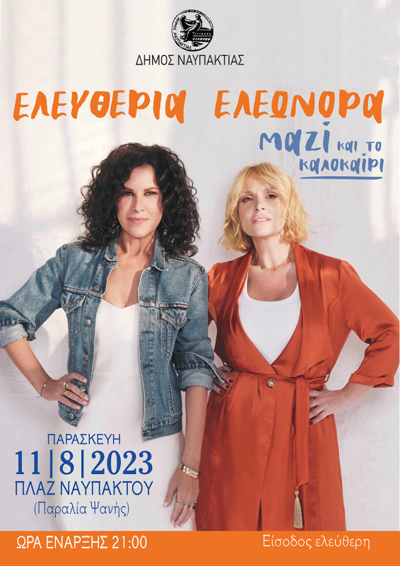 Ο Δήμος Ναυπακτίας σας προσκαλεί όλους στη μεγάλη συναυλία του καλοκαιριού με την Ελευθερία Αρβανιτάκη και την Ελεωνόρα Ζουγανέλη, την Παρασκευή, 11 Αυγούστου 2023 στις 9 το βράδυ – Είσοδος ελεύθερη!