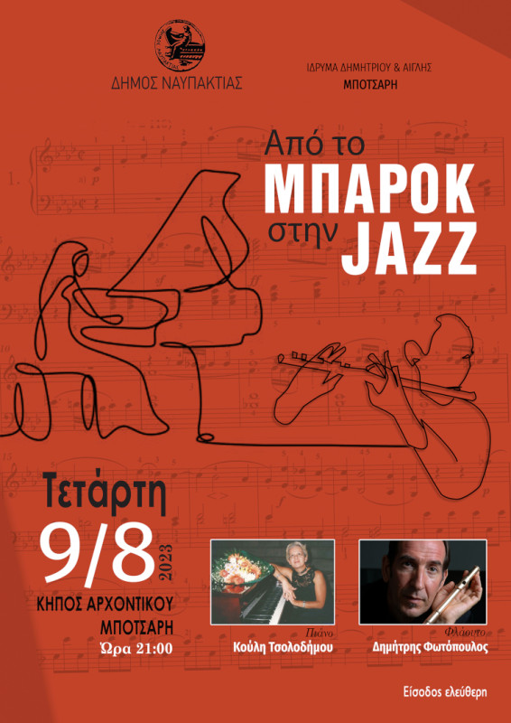«Από τη Μπαρόκ στην Τζαζ». Σε μία μοναδική μουσική βραδιά προσκαλεί όλους ο Δήμος Ναυπακτίας, αυτή την Τετάρτη, 9 Αυγούστου 2023 και ώρα 21:00, στον Κήπο του Αρχοντικού Μπότσαρη.