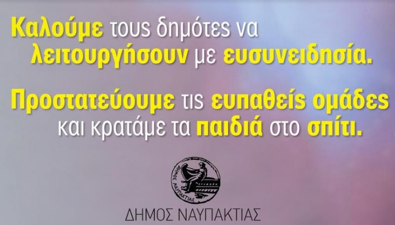 Ο Δήμος Ναυπακτίας συνεχίζει να ενημερώνει για τις οδηγίες που θα πρέπει να ακολουθούν οι δημότες και για τα μέτρα που λαμβάνει με στόχο την προστασία και την αντιμετώπιση της εξάπλωσης του νέου κορωνοϊού.