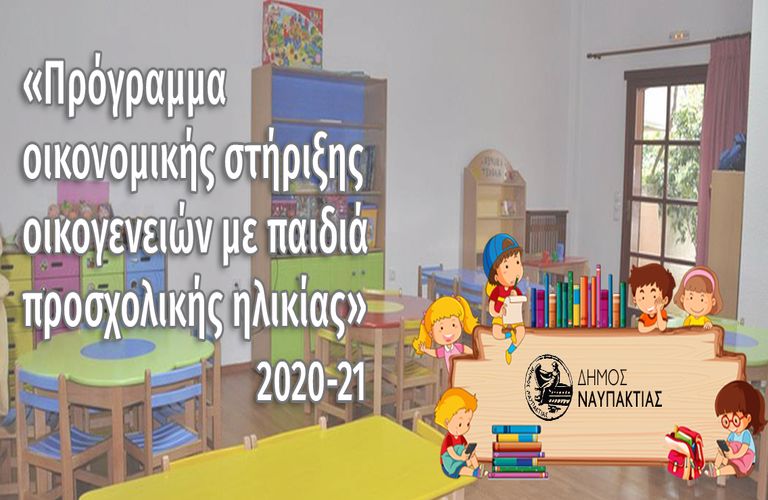 Ο Δήμος Ναυπακτίας ενημερώνει τους ενδιαφερόμενους γονείς ότι εκδόθηκε από την ΕΕΤΑΑ η Πρόσκληση Εκδήλωσης Ενδιαφέροντος για το «Πρόγραμμα Οικονομικής Στήριξης Οικογενειών με Παιδιά Προσχολικής Ηλικίας» 2020-2021, που επεκτείνεται στις οικογένειες των υπαλλήλων (μονίμων και αορίστου) του Δημοσίου, των Νομικών Προσώπων Δημοσίου Δικαίου (ΝΠΔΔ) και των Οργανισμών Τοπικής Αυτοδιοίκησης (ΟΤΑ), καθώς και σε παιδιά οικογενειών εργαζόμενων στον ιδιωτικό τομέα, που δεν μπορούν να συμμετέχουν στο Πρόγραμμα «Εναρμόνιση Οικογενειακής και Επαγγελματικής Ζωής», λόγω των ιδιαίτερα χαμηλών εισοδηματικών κριτηρίων που θέτει.