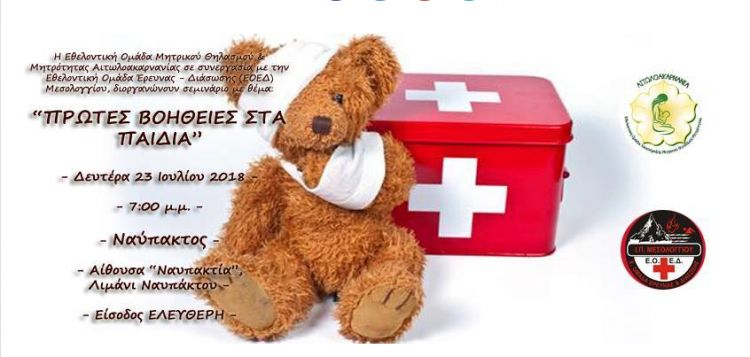 Εθελοντική Ομάδα Υποστήριξης Μητρικού Θηλασμού και Μητρότητας του νομού Αιτωλοακαρνανίας (www.facebook.com/groups/aitoloakarnania.thilasmos/) μέλος του Πανελληνίου Δικτύου Εθελοντικών Ομάδων Υποστήριξης Μητρικού Θηλασμού και Μητρότητας και η Εθελοντική Ομάδα Έρευνας και Διάσωσης (Ε.Ο.Ε.Δ) Ι.Π. Μεσολογγίου (http://www.eoed.gr/) διοργανώνουν στην Ναύπακτο σεμινάριο με θέμα: Πρώτες βοήθειες στα παιδιά. Το σεμινάριο θα πραγματοποιηθεί την Δευτέρα 23 Ιουλίου 2018 και ώρα 7.00 μ.μ. στην αίθουσα “Ναυπάκτια” στο λιμάνι της Ναυπάκτου. Είσοδος ελεύθερη