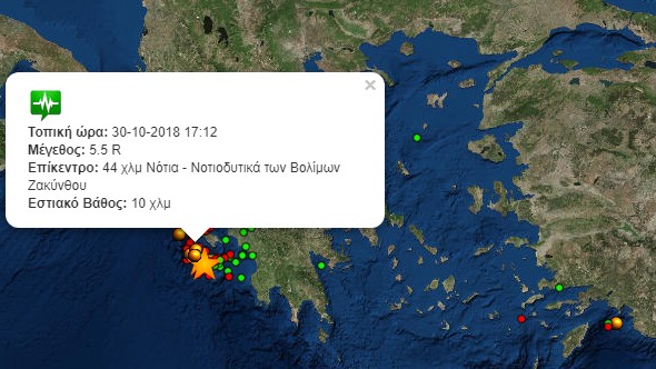 Στις 17:12 το απόγευμα της Τρίτης σημειώθηκε νέα ισχυρή σεισμική δόνηση μεγέθους 5,5R. Το επίκεντρο του σεισμού εντοπίστηκε σε θαλάσσια περιοχή 44 χλμ. Νότια – Νοτιοδυτικά των Βολίμων Ζακύνθου.