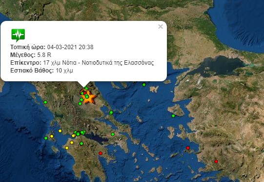 Στις 20:38 το βράδυ της Τσικνοπέμπτης σημειώθηκε μία νέα ισχυρή σεισμική δόνηση μεγέθους 5,8 βαθμών της κλίμακας ρίχτερ με επίκεντρο και πάλι την Ελασσόνα και πιο συγκεκριμένα 17 χιλιόμετρα Νότια – Νοτιοδυτικά.