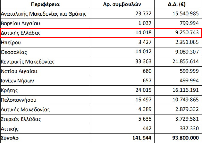 Η κατανομή Δημόσιας Δαπάνης και αριθμός συμβουλών ανά Περιφέρεια, σύμφωνα με τον νέο πίνακα, έξει ως εξής: