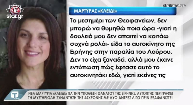 Όταν σταμάτησε το αυτοκίνητο, είδε να κατεβαίνουν από μέσα 3 άτομα. Η μία, όπως λέει ο ίδιος ο μάρτυρας, ήταν η 44χρονη Ειρήνη και άλλοι δύο άνδρες, αδύνατοι, ο ένας με κοντά μαλλιά και ο άλλος με μακριά μαλλιά.
