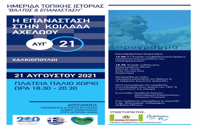Το Σάββατο 21 Αυγούστου 2021 ακολουθεί πολυθεματική εκδήλωση στην πλατεία του παλιού Χαλκιόπουλου, η οποία περιλαμβάνει: Περιβαλλοντική δράση – περιήγηση στα μονοπάτια των κλεφταρματολών στις 14:00, ενώ στις 18:30 ακολουθεί εκδήλωση με τους παρακάτω εισηγητές: τον δικηγόρο Παναγιώτη Νικολόπουλο («Ιστορικά Μονοπάτια του Βάλτου – πρόταση αξιοποίησης τους»), τον πολιτικό μηχανικό, προέδρο του φορέα «Χερσόνησος Αίμου» Γιώργο Γεωργού («Το Αθάνατο κλέφτικο τραγούδι και η σημασία του, Σαρακατσάνικη στάνη – η οικονομική & στρατιωτική της συνεισφορά στον αγώνα του 1821») και τον κτηνίατρο Ιωάννη Αραβανή («Σύγχρονη Ορεινή Κτηνοτροφία & η Βιωσιμότητά της σήμερα»).