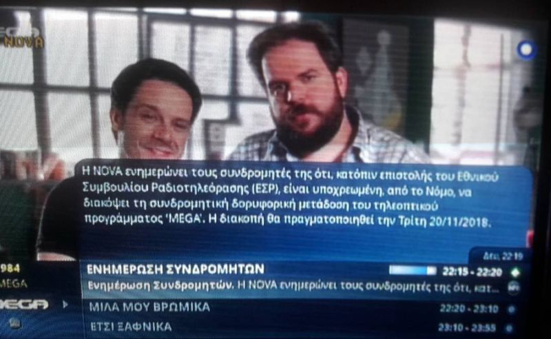 Η Nova ενημερώνει τους συνδρομητές της ότι, κατόπιν επιστολής του Εθνικού Συμβουλίου Ραδιοτηλεόρασης (Ε.Σ.Ρ.), είναι υποχρεωμένη, από το Νόμο, να διακόψει τη συνδρομητική δορυφορική μετάδοση του τηλεοπτικού προγράμματος Mega. Η διακοπή θα πραγματοποιηθεί την Τρίτη 20/11/2018.