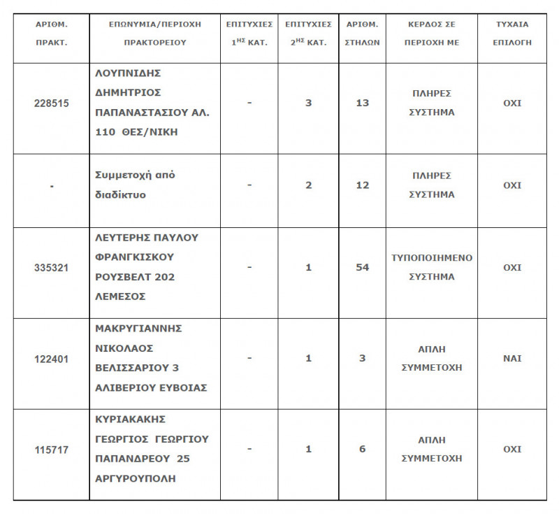 Επίσης στην δεύτερη κατηγορία (5άρια) βρέθηκαν οκτώ (8) επιτυχίες, οι οποίες κερδίζουν το ποσό των €17.466,48 έκαστη.
