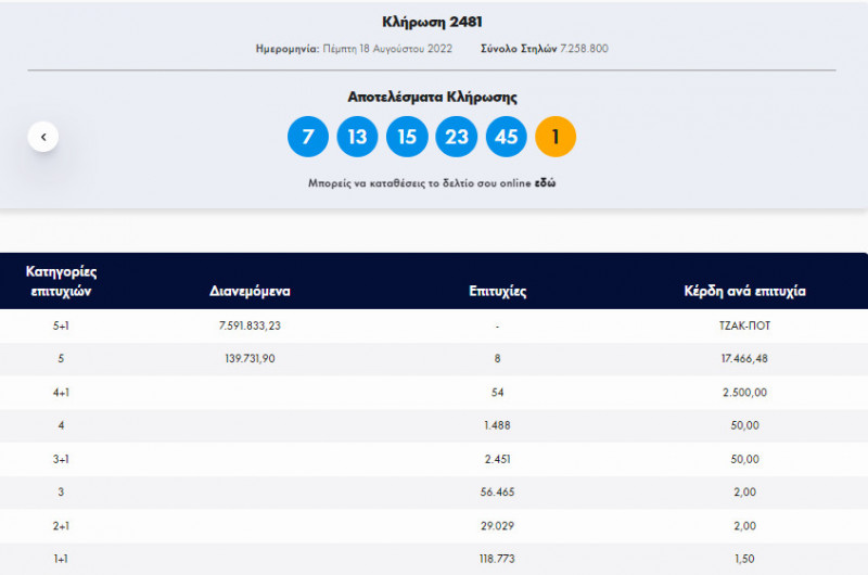 €8.888.888 τουλάχιστον θα μοιραστούν οι τυχεροί της 1ης κατηγορίας στην επόμενη κλήρωση της Κυριακής 21/8/2022 μετά το Τζακ-Ποτ που σημειώθηκε κατά τη σημερινή διαλογή της 2481ης κλήρωσης του Τζόκερ.