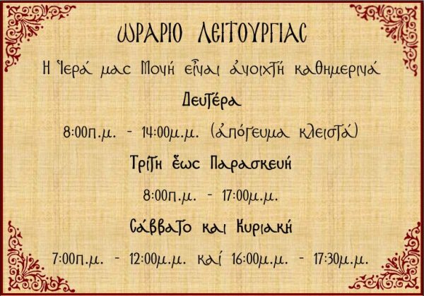 Νέο ωράριο λειτουργίας στην Ιερά Μονή Τιμίου Προδρόμου Βομβοκούς Ναυπάκτου
