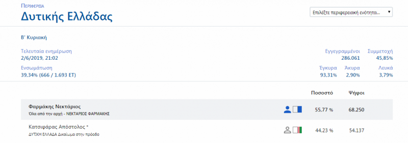Σύμφωνα με τα όσα μεταδίδει μέχρι και αυτή την ώρα τόσο η ιστοσελίδα της Περιφέρειας, όσο και εκείνη του Υπουργείου Εσωτερικών νέος Περιφερειάρχης Δυτικής Ελλάδας αναδεικνύεται ο Αγρινιώτης Νεκτάριος Φαρμάκης.