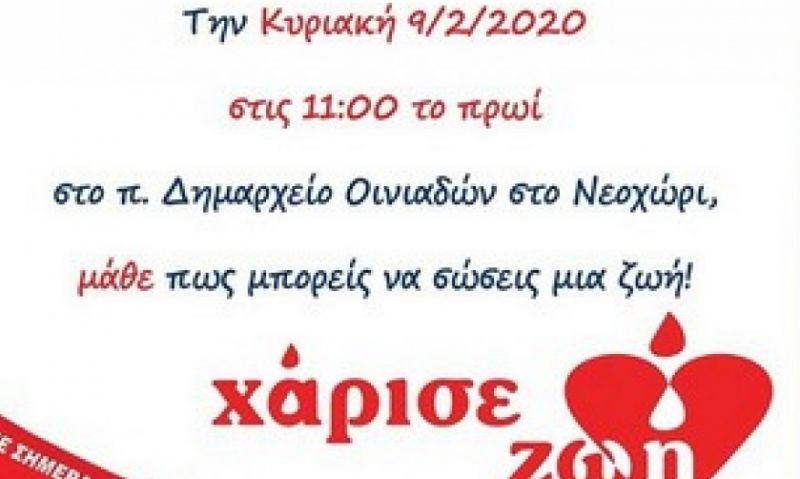 Την Κυριακή 9 Φεβρουαρίου 2020 στις 11:00 το πρωί στο π. Δημαρχείο Οινιαδών στο Νεοχώρι, μάθε πώς μπορείς να σώσεις μια ζωή!