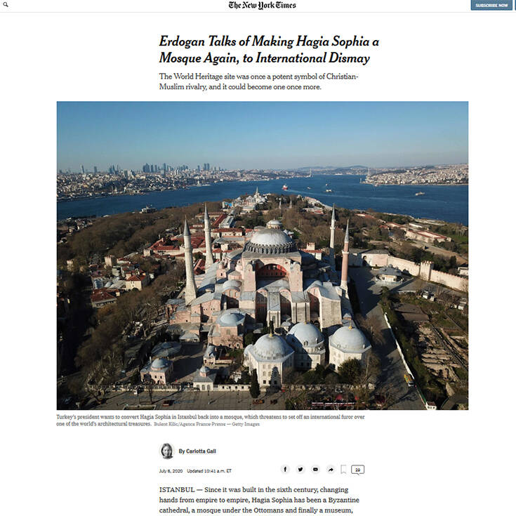 «Ο Ερντογάν κάνει λόγο για εκ νέου μετατροπή της Αγίας Σοφίας σε τέμενος, προκαλώντας παγκόσμια ανησυχία», αναφέρει ο τίτλος της New York Times και συμπληρώνει για το μνημείο παγκόσμιας κληρονομιάς πως: «υπήρξε ισχυρό σύμβολο αντιπαλότητας μεταξύ Χριστιανών και Μουσουλμάνων και θα μπορούσε να ξαναγίνει».
